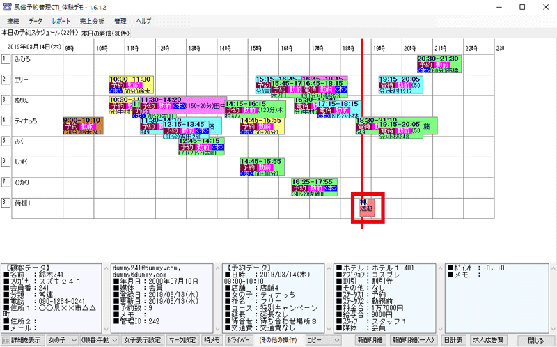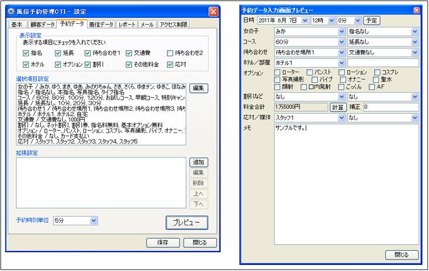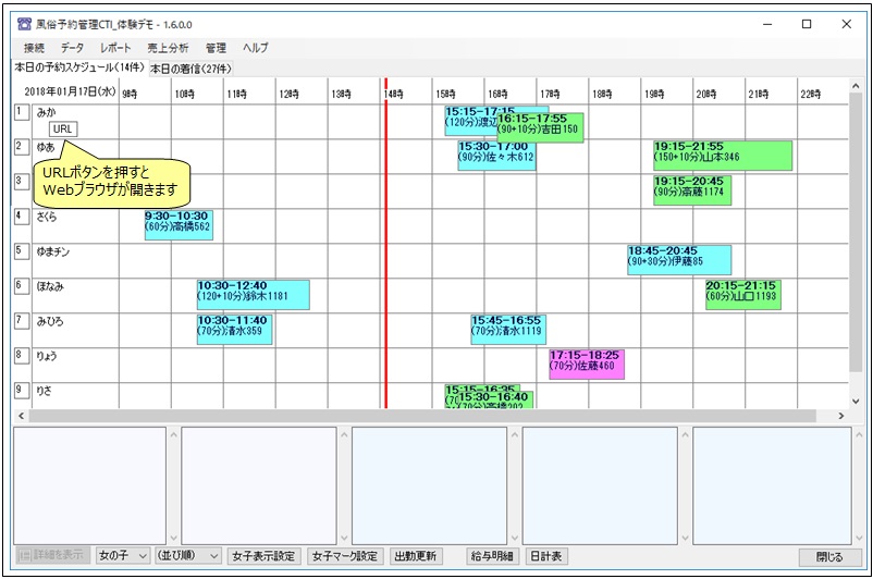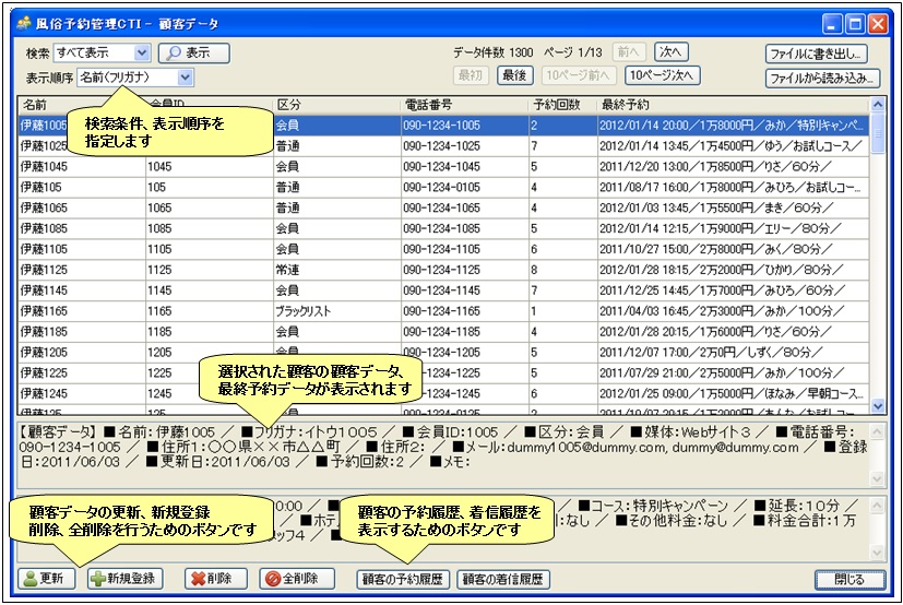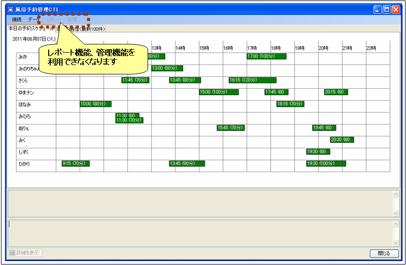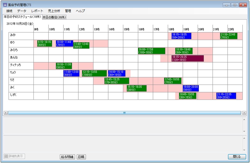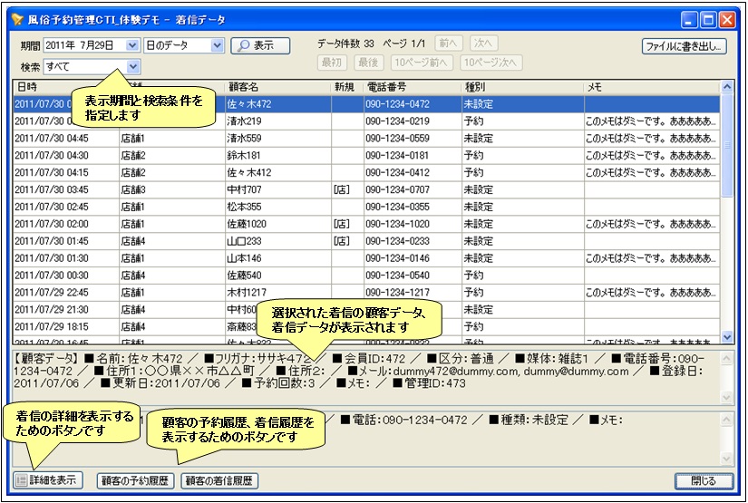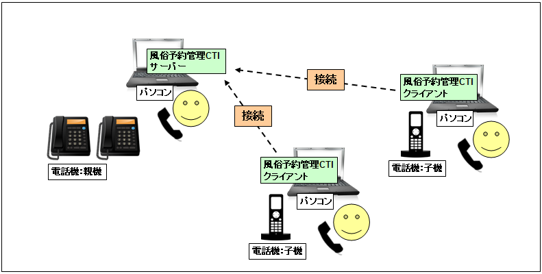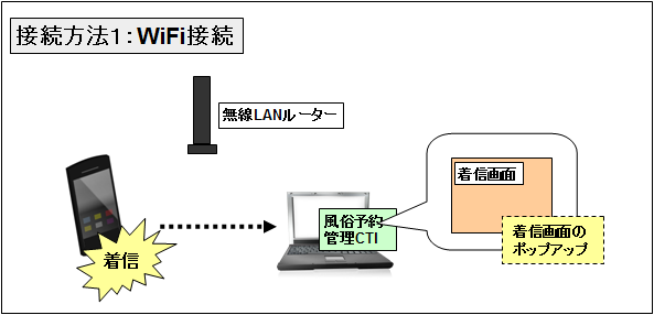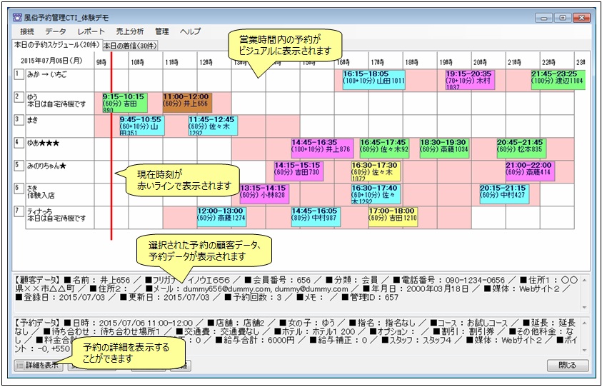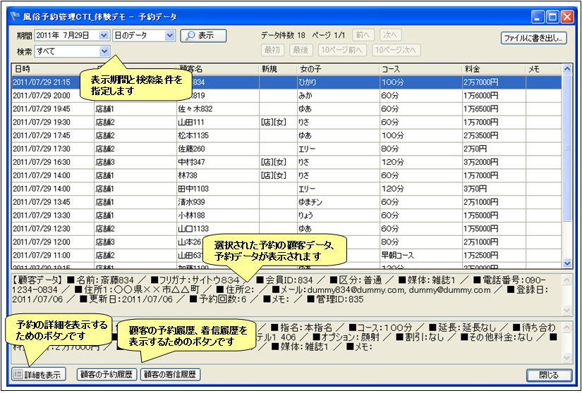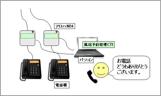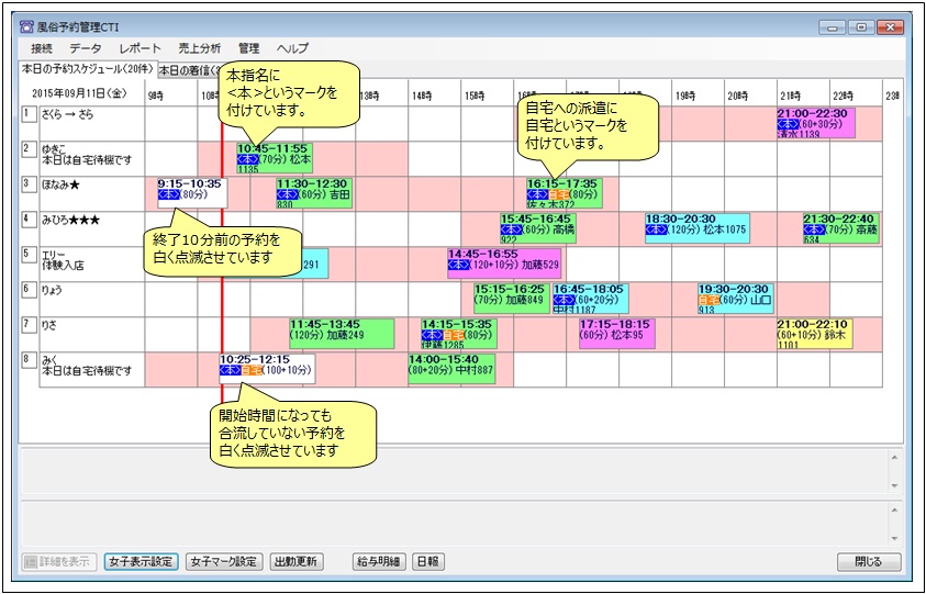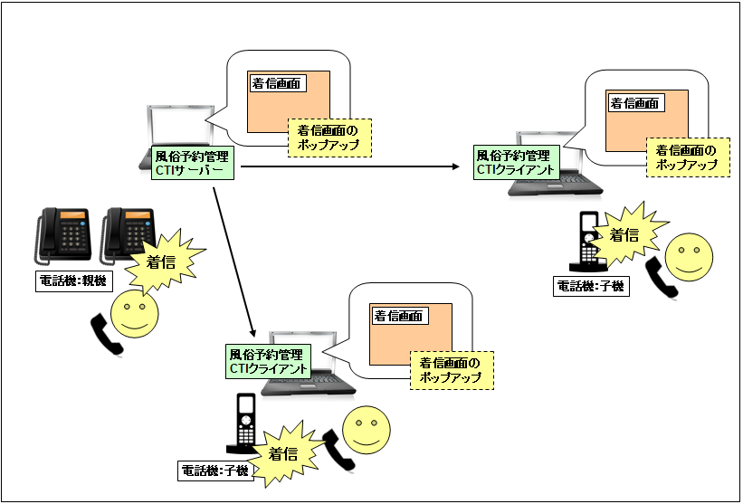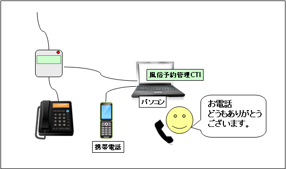 風俗予約管理CTIの機能お客様から電話を受けたときに、お客様の情報や、お客様の過去の予約情報が表示されます。