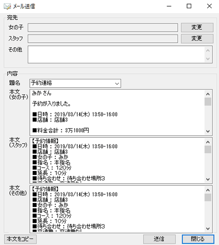予約を受け付けたときに、女の子やスタッフ(ドライバーや店長など)に簡単にメールを送信することができます。 メールの文章は自由にカスタマイズすることができます。