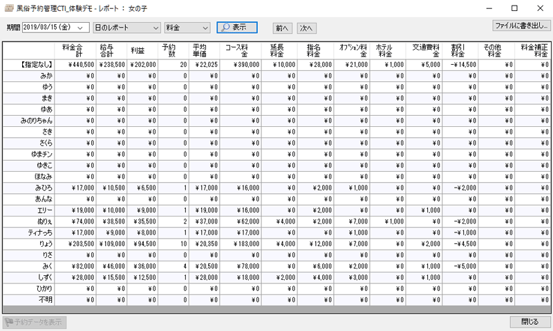 過去の利用履歴データ(日時、回数、売上)をクリアして、顧客ごとの利用した女の子の情報に変換することができます。