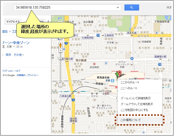 緯度,経度は、Google Map上で右クリックして「この座標について」を実行すると調べることができます。