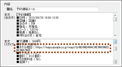 メールテンプレート中の $User#urlMap$ という文字列が、顧客データの住所の地図へのリンクに置換されます。また、$Reserve#hotelUrlMap$ という文字列が、予約データのホテルの地図へのリンクに置換されます。
