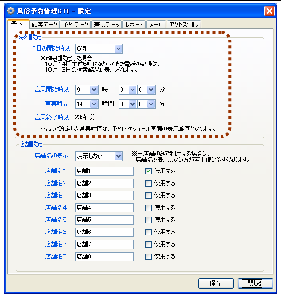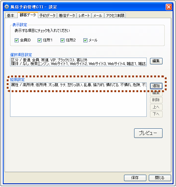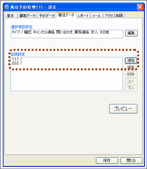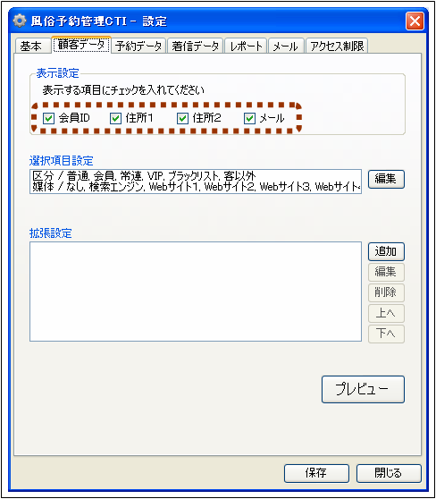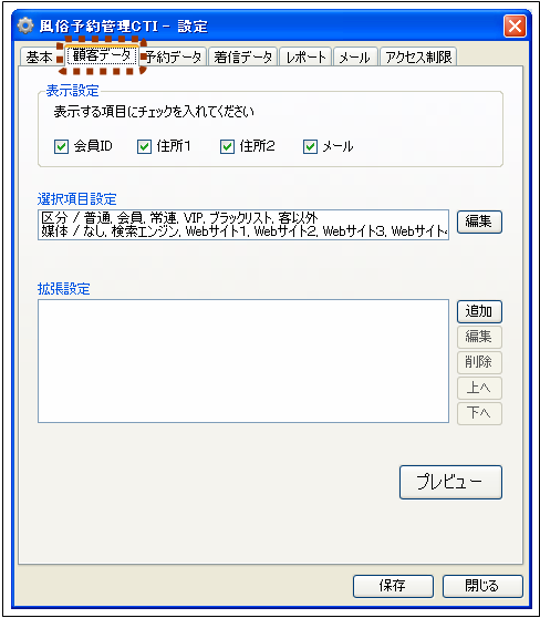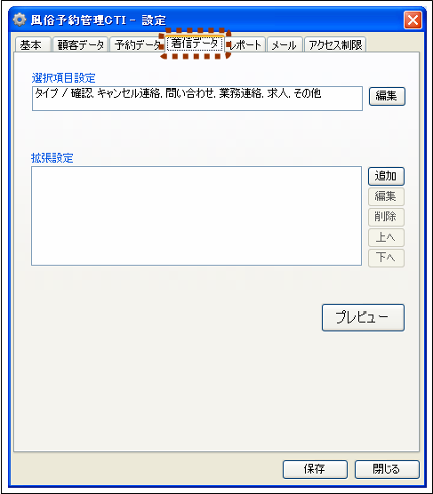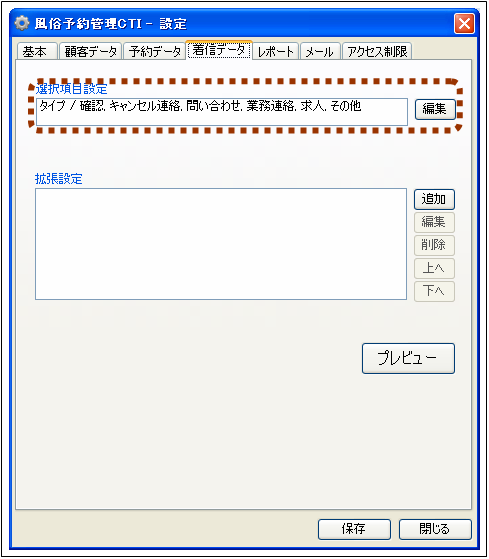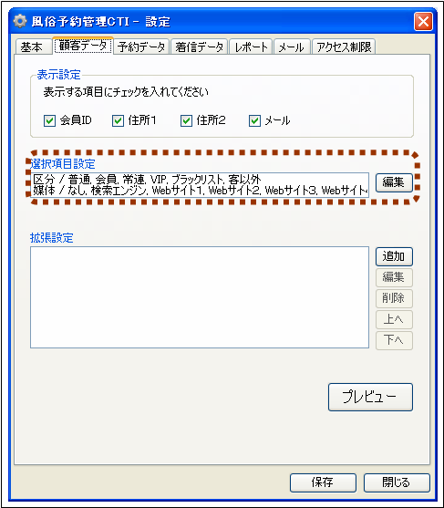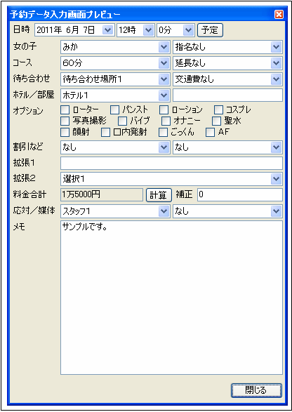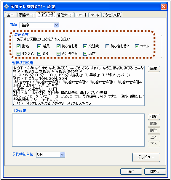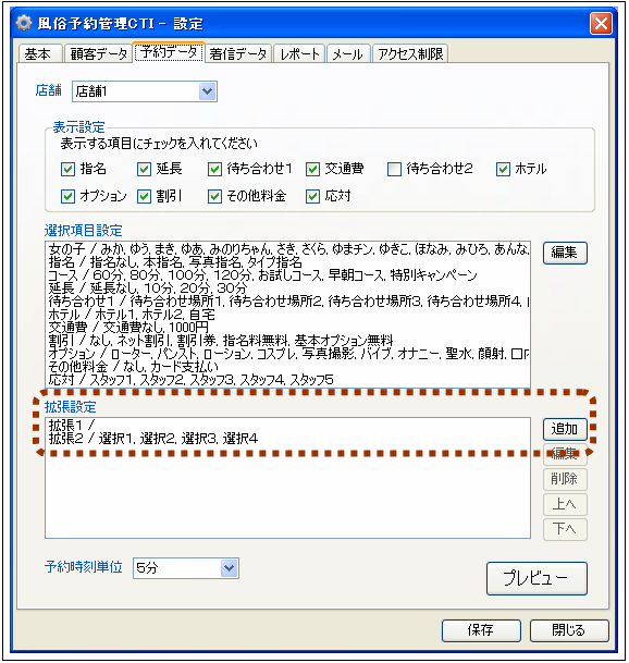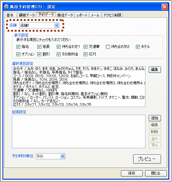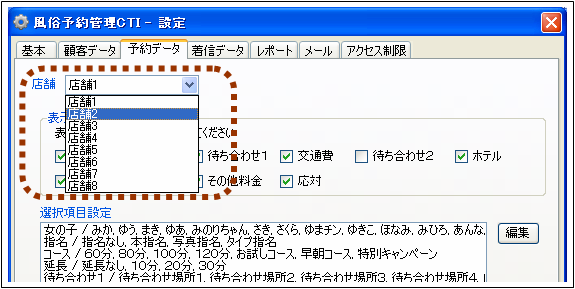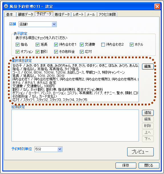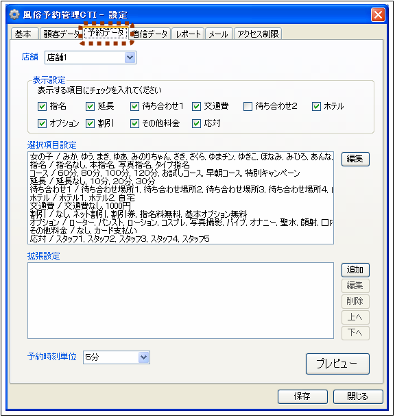4. 「女の子」「指名」「コース」「延長」「待ち合わせ」「ホテル」「交通費」「割引」「オプション」「その他料金」「応対」の選択項目を設定します。