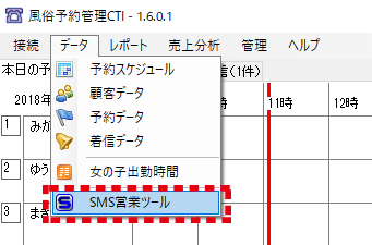 3. メイン画面の「データ」メニューから、「SMS営業ツール」を実行します。