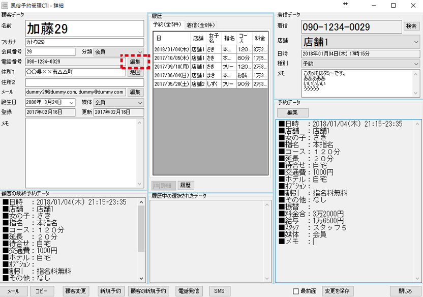 (1) 顧客データの「電話番号」の横にある「編集」ボタンを押します。