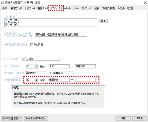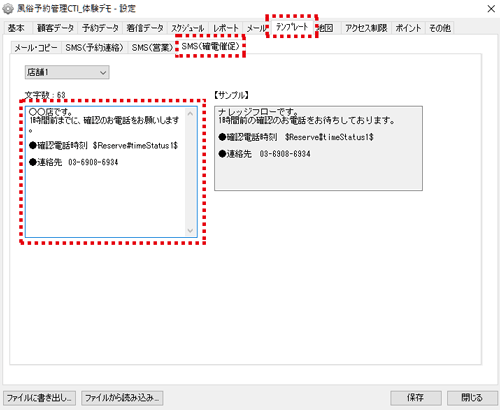 1. 設定画面の「テンプレート」タブから「SMS(確電催促)」タブを開き、確認電話催促に使う文章(テンプレート)を入力します。