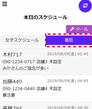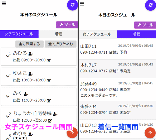 本日のスケジュール画面には、女子スケジュール画面と着信一覧画面があります。
