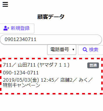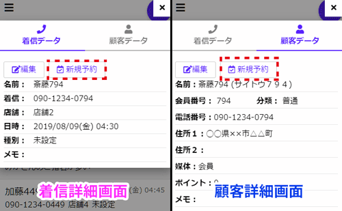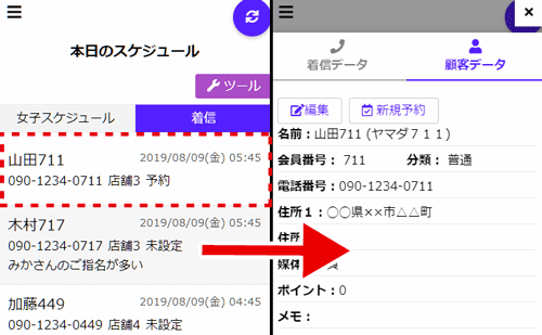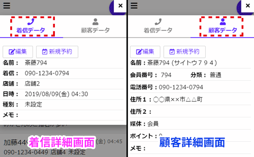 着信データを押すと、その電話をかけた顧客の情報が表示されます。