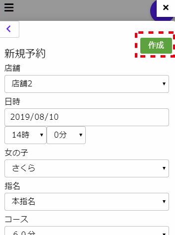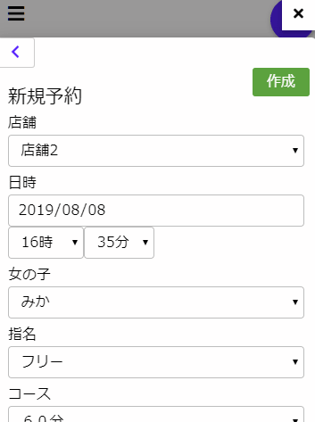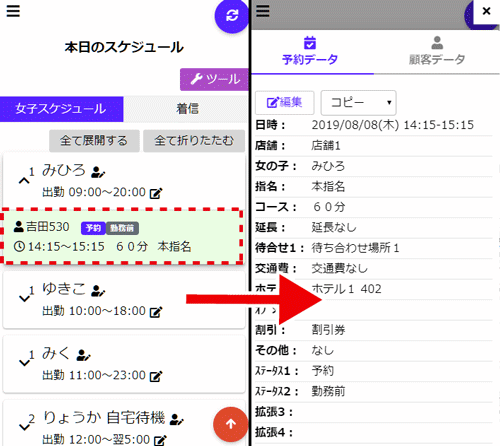 女子スケジュール画面の予約データを押すと、予約詳細画面を開くことができます。