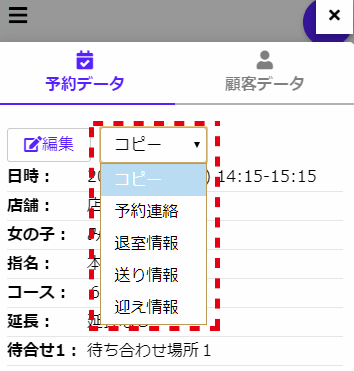 予約詳細画面のコピー欄でテンプレートを選択すると、予約データや顧客データの内容をコピーすることができます。