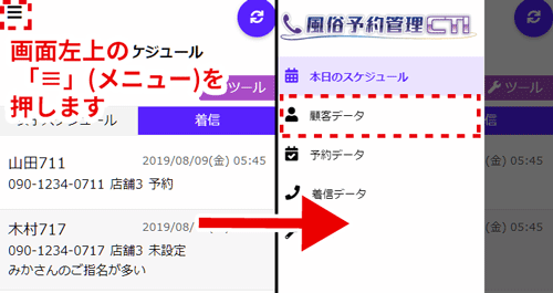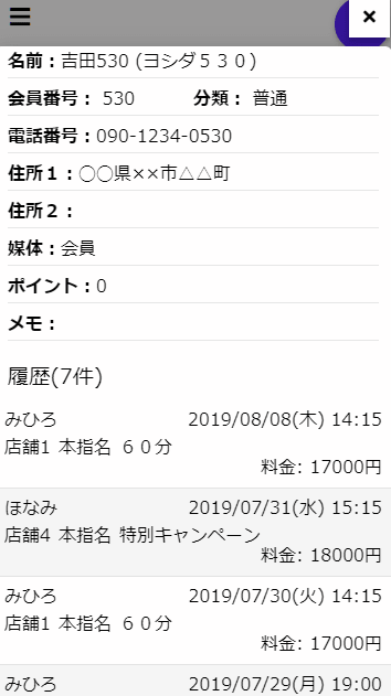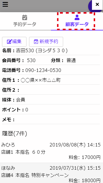 予約詳細画面の顧客データタブを押すと、顧客詳細画面を開くことができます。