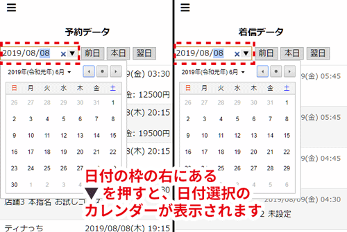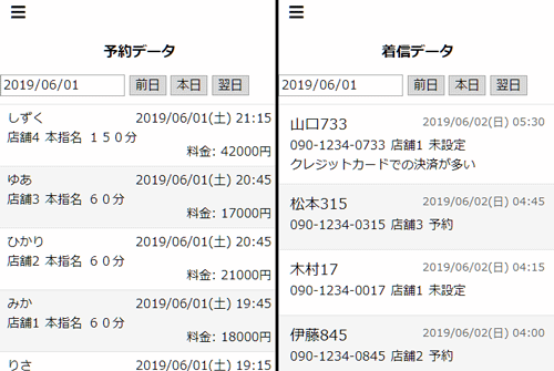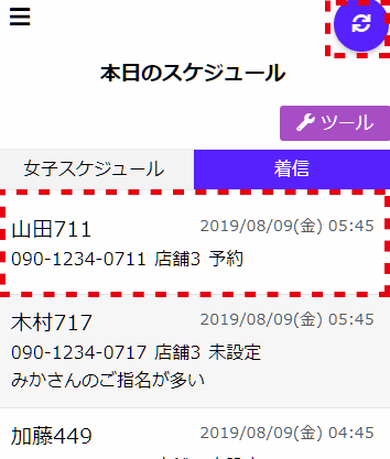 女子スケジュール画面の女子の欄を押すと、その女子の予約データ一覧が表示されます。