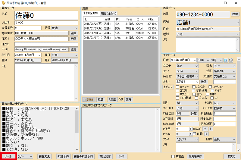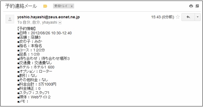 メール送信機能を利用すると、女の子・スタッフ・その他(店長やドライバーなど)へ、ボタンを押すだけでメールを送信することができます。