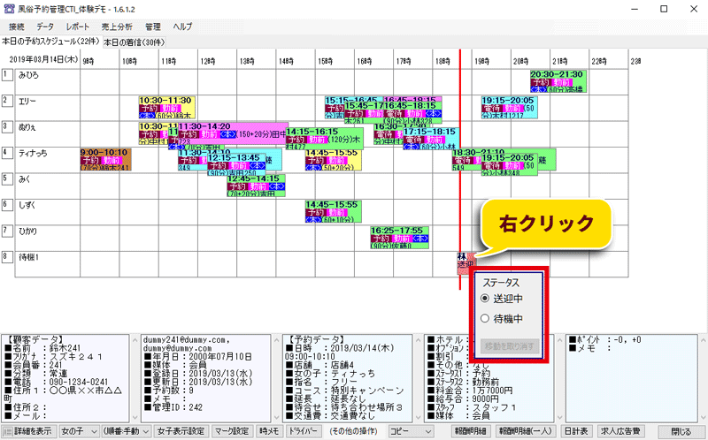 1. スケジュール画面の予約データの上で右クリックをすると、予約データのステータスを変更できます。