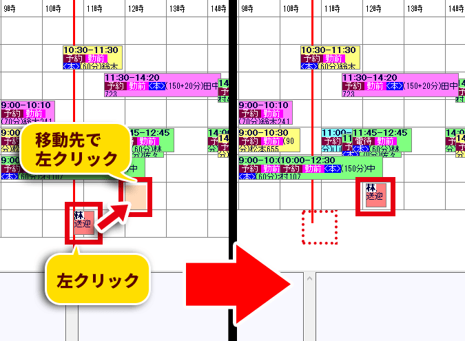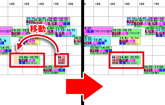 また、予約データの少し前に(移動中表示の後ろの部分が予約データと重なるように)移動させると、その予約データの前に付けることができます。