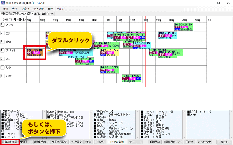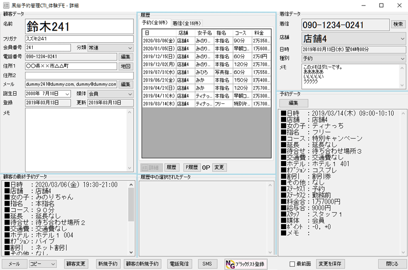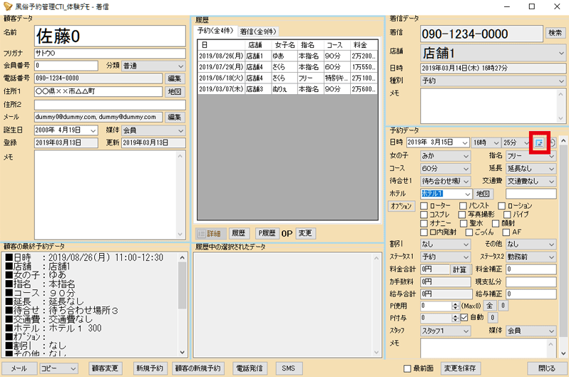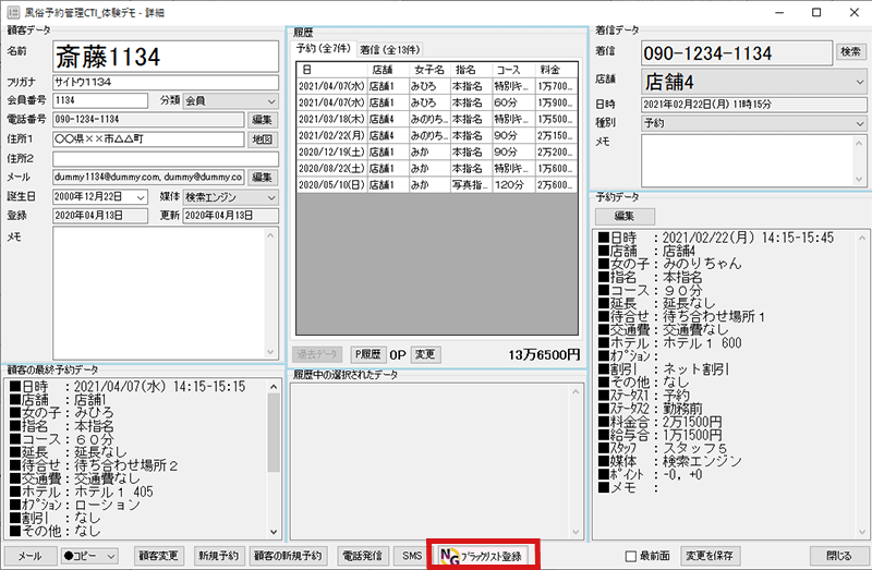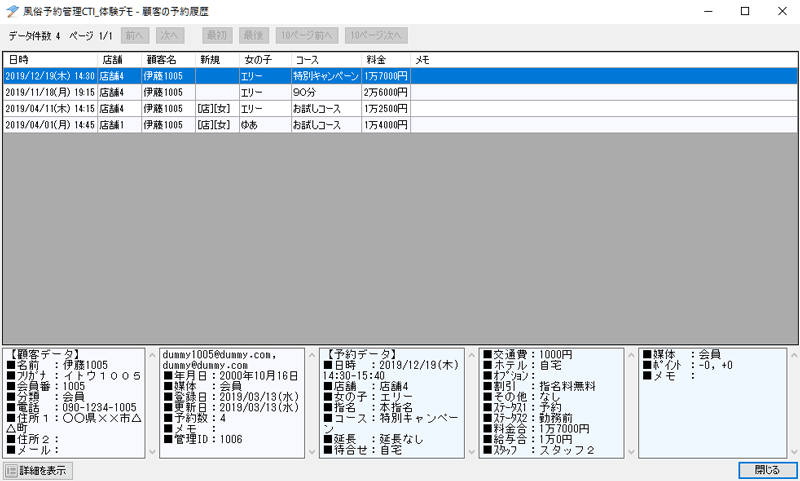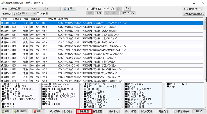 4. 顧客データを選択した状態で「顧客の予約履歴」ボタンを押すと、顧客の予約の履歴を表示することができます。