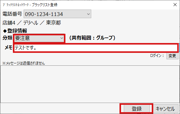 2. 分類「要注意」を選択し、メモ「テストです。」を入力して、登録ボタンを押します。