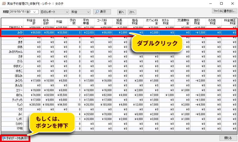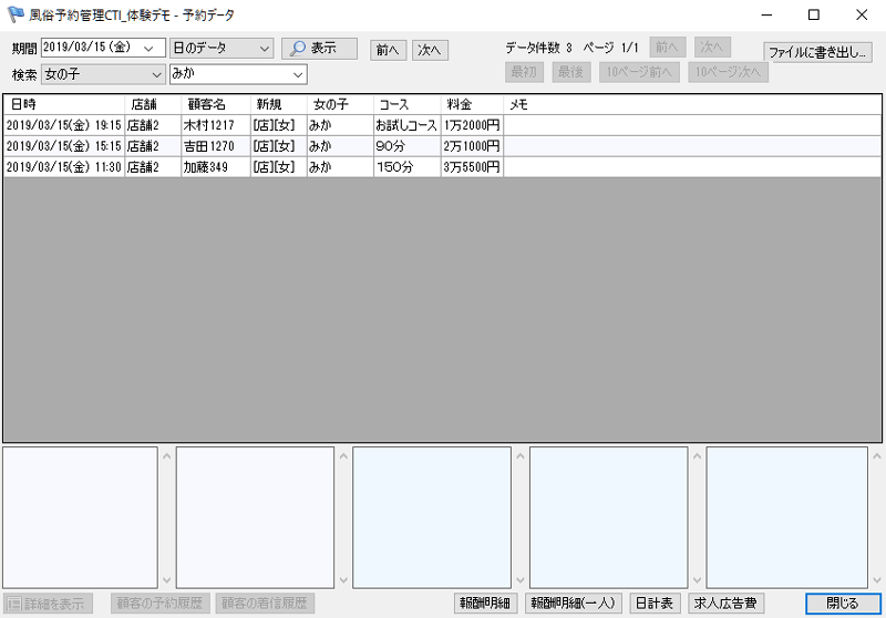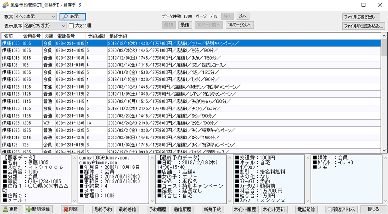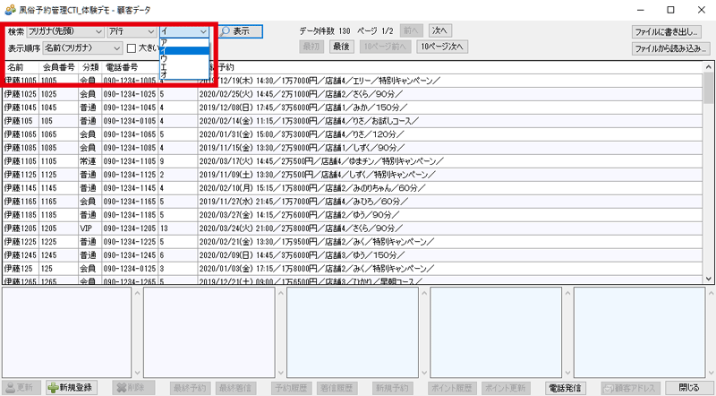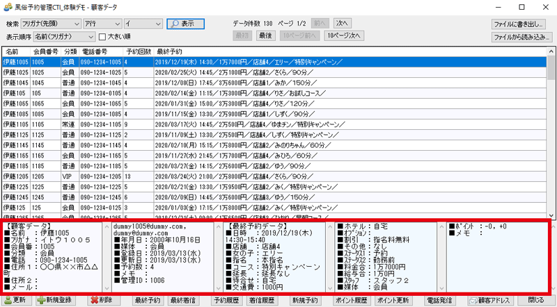 3. 一覧の中の顧客データをクリックすると、画面下部に、「顧客データ」と「最終予約データ」が表示されます。